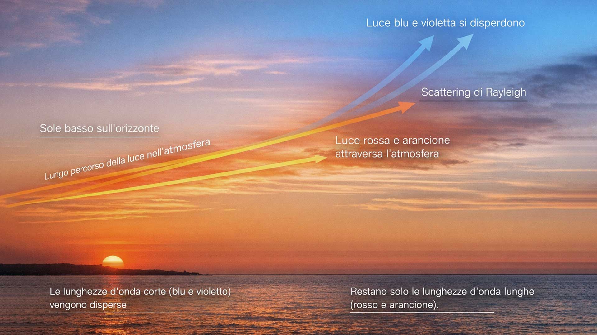 Solo le lunghezze d’onda più robuste e lunghe, il rosso e l’arancione, riescono a sopravvivere al lungo percorso e a raggiungere i nostri occhi.